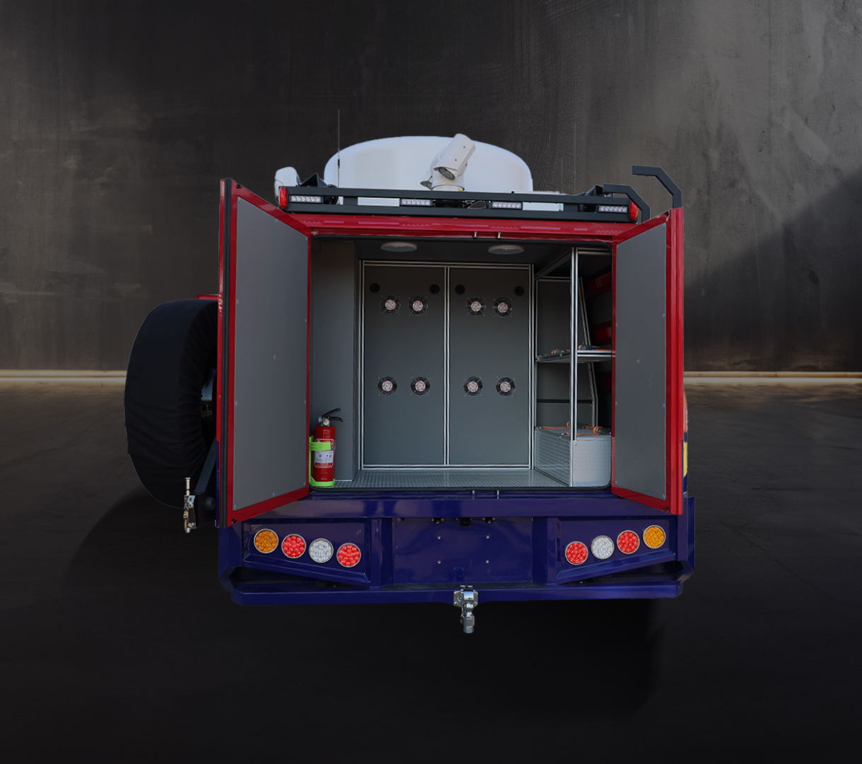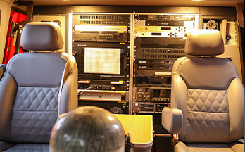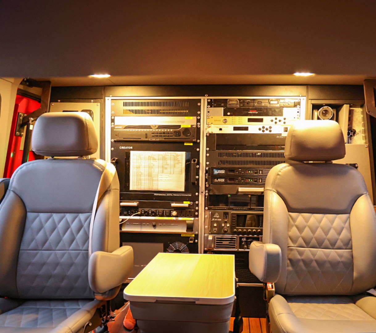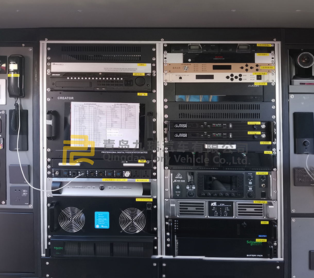 九瑞牌福特F550通信指挥车车内平台按功能分为三段,前部驾驶舱、中部操作舱、后部设备舱;操作舱设有两个可旋转座椅,方便进行通信设备操作;后部设备舱可配备电缆盘、发电机控制单元、UPS主机、蓄电池、杂物柜,设备配重布局合理,安装平衡稳固。