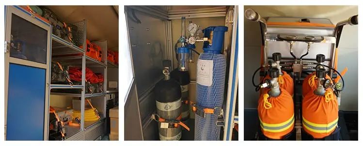 该救险车不仅配备常规的通信、指挥、供电、照明、破拆等功能系统,九瑞更是结合隧道抢险现状,研发集成了供水、流食输送、防碰撞无人机监控、气体监测及防护等几个特殊模块;在抢险救援中降低抢修人员的劳动强度和避免人员生命财产的损失,大大提高工作效率。