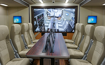 2) 九瑞牌汕德卡大型大型方舱通信指挥车有独立的供电系统和完整的监测实验设备,通过车载多媒体设备对现场音频、视频数据进行采集、备份,能实现工程现场与后方指挥中心的实时通信,并能进行视频会仪和远程指挥工作。